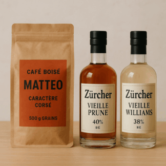 Café Boisé : Matteo, caractère corsé (500 g grains) + Zürcher Vieille Prune, 40 %, BE, 20 cl + Zürcher Vieille Williams, 38 %, BE, 20 cl
